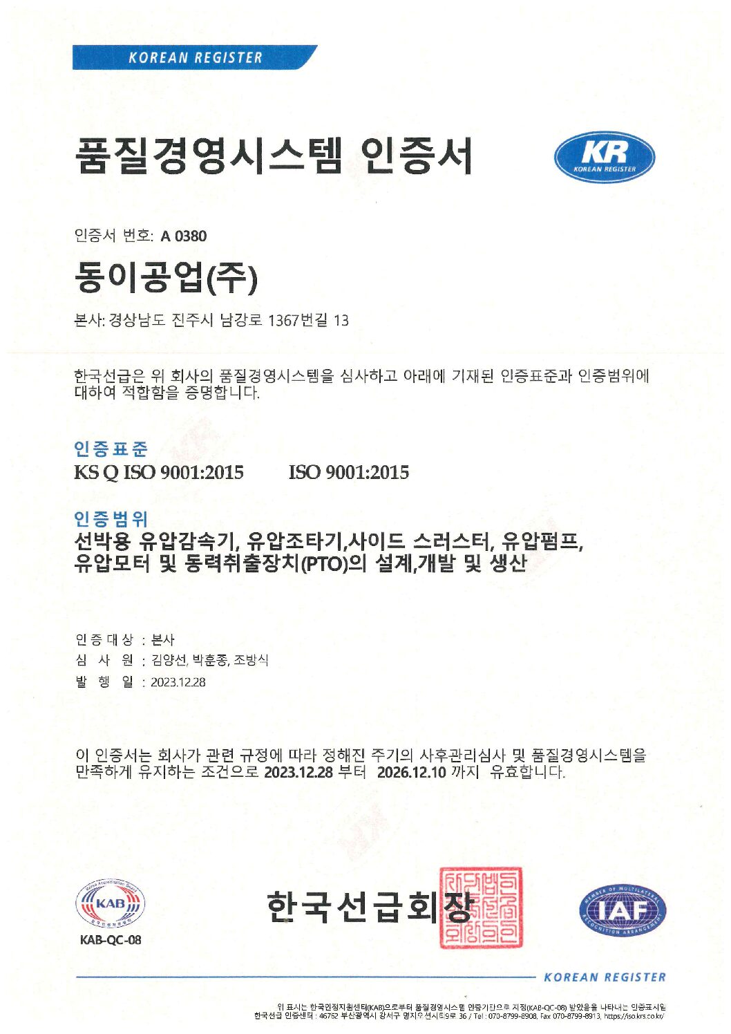 인증범위 ; 선박용 유압감속기, 유압조타기,사이드 스러스터, 유압펌프, 유압모터 및 동력취출장치(PTO)의 설계,개발 및 생산