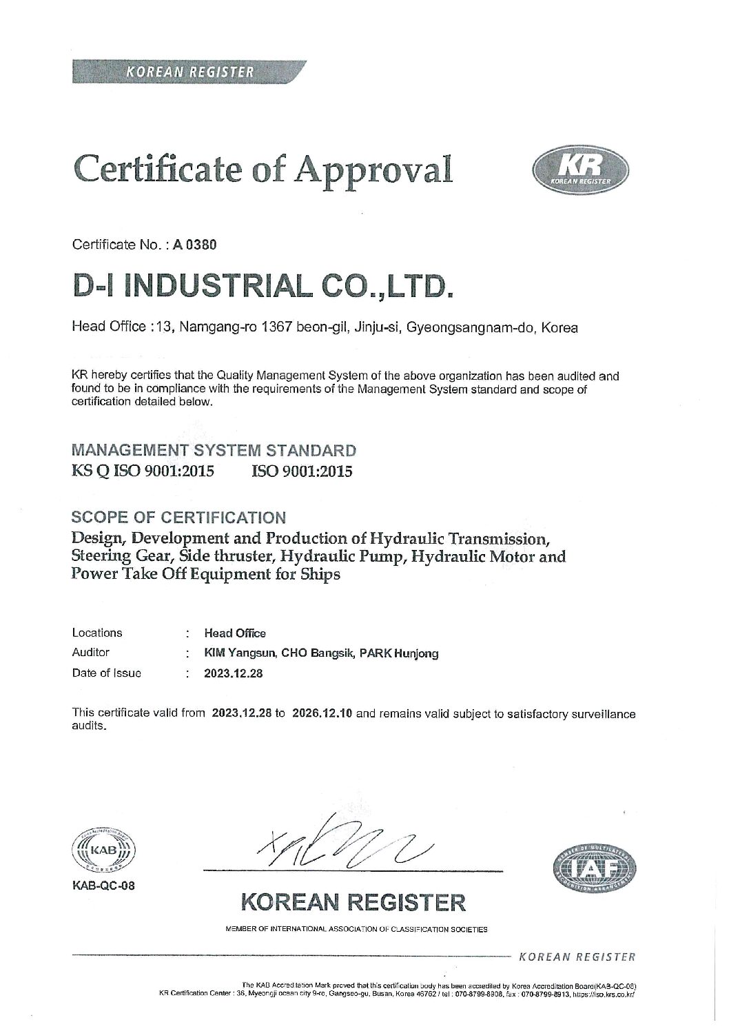 Scopr of certification : Design, Development and Production of Hydraulic Transmission,Steering Gear, Side thruster, Hydraulic Pump, Hydraulic Motor and Power Take Off Equipment for Ships”
